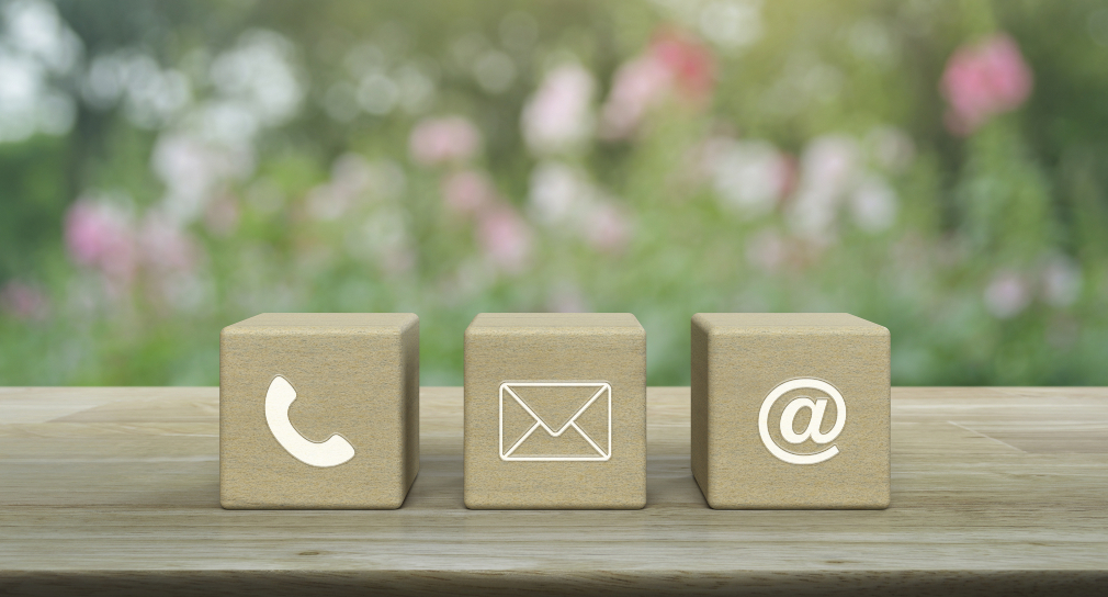 Symbolbild: 3 kleine Würfel mit 3 Symbolen (Telefon, Briefumschlag, @ Zeichen)