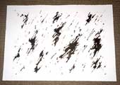• 17 Henri Michaux, „Ohne Titel“, tachistische Fleckenmalerei. Tintenflecke oder Tuschflecke zeigen eine Suggestion vulkanischen Geschehens als Gesten seelischer Bewegung, die in den Flecken sichtbar werden. Ihr Wesen ist die Bewegung, ihre Erscheinung die Spur. Vorstellungen, bereits vorhandene Bilder, die durch mein Gedächtnis ziehen, werden dadadurch gezwungen unmittelbar zu erscheinen. Es muss etwas sein, das beim Betrachter sofort etwas erzeugt, das dessen innere Welten anspricht.