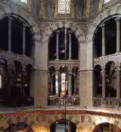 • 02 Pfalzkapelle, Aachener Dom, c. 790/95. Karl der Große hat für seine Krönungskirche Säulen aus Rom und Ravenna herbeischaffen lassen. Die Säulen haben keinen technischen Zweck zu erfüllen, sie zeigen nur die Macht des Herrschers. Das Zitat spielt darauf an, das Erbe dieser glanzvollen Epoche anzutreten.