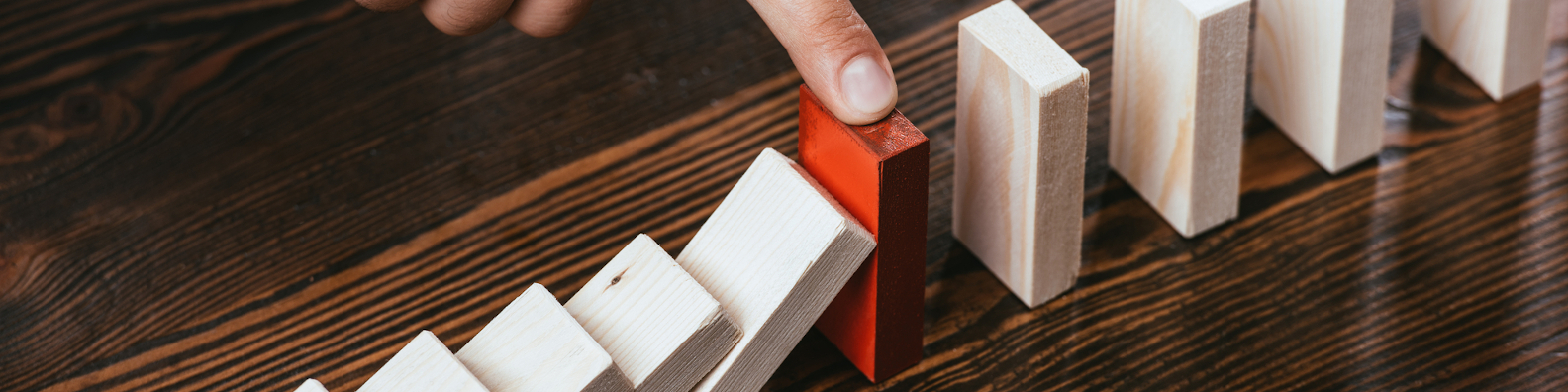 Foto: Hand stoppt das Umfallen einer Dominoreihe (Symbolbild: Prävention)